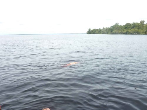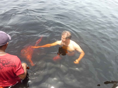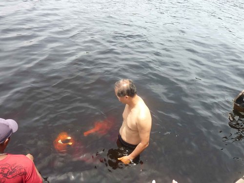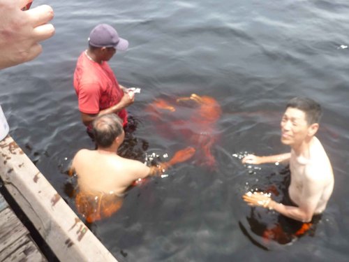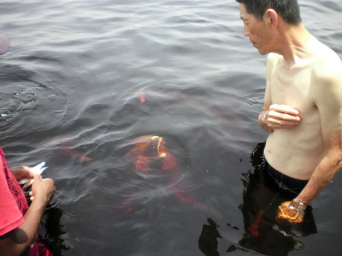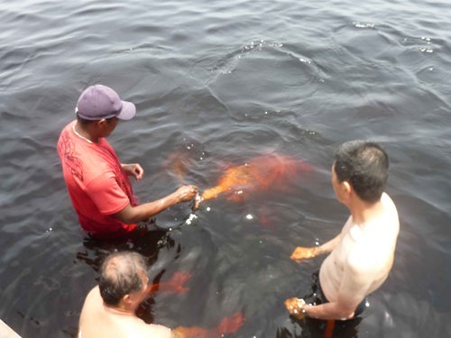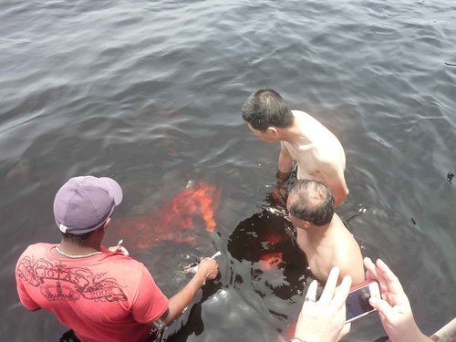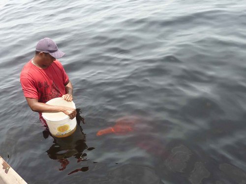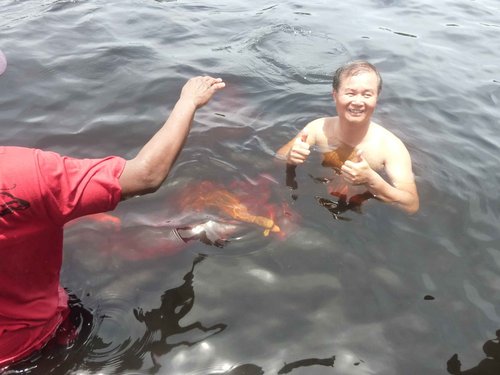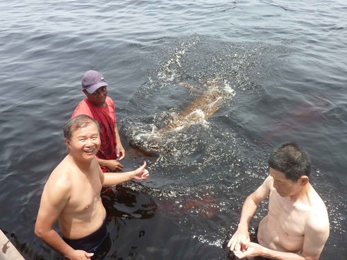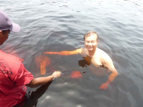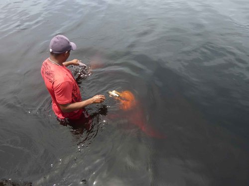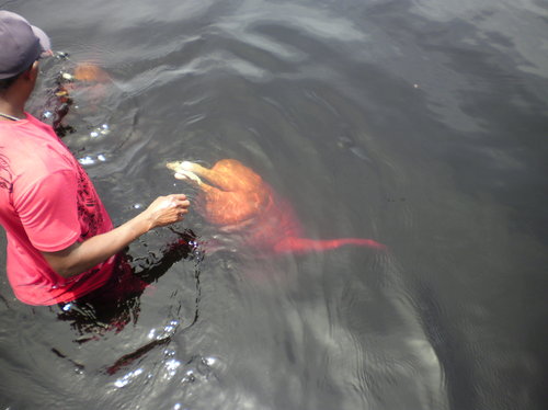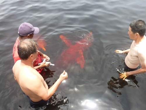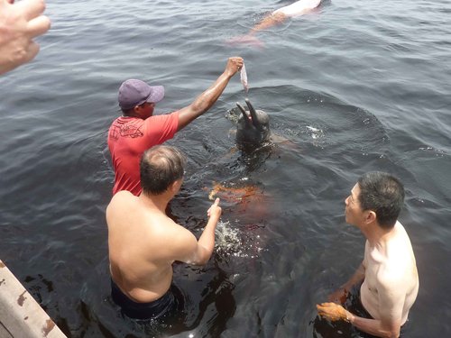 粉紅河豚很聰明,看到餵食者下水馬上靠過來.