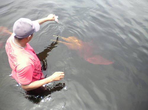 觀賞粉紅河豚,手要放在水裡,不要抬高,以免被它誤解是食物而獵食.