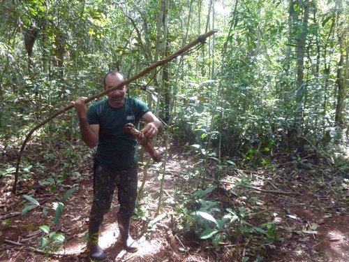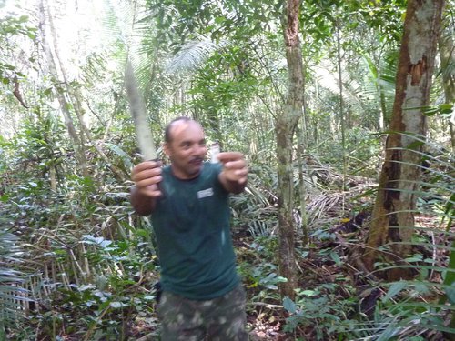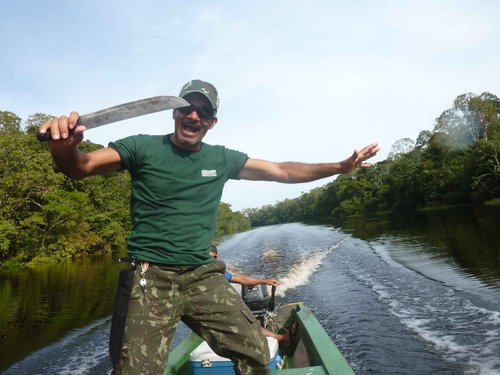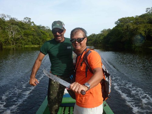 嚮導米藍達 Miranda還抽出刀來吆喝,看起來亞馬遜探險好像玩真的.