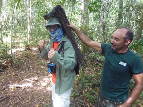 進入雨林前先著裝,全身包得緊緊的,免得被蚊蟲咬傷或毒樹勾到.