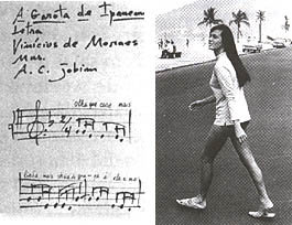 這首The Girl from Ipanema源起,巴西的首都里約熱內盧有一處叫Ipanema 的海灘。Jobim(作曲者)因為就住在這附近,所以常和另一位作詞家Vinicius de Moraes耗在當地Rua Montenegro街上一家名叫 Veloso 的酒吧。他們倆每天都會看到一位美麗的高中女孩在放學時從酒吧前經過,因而寫了一首歌叫Garota de Ipanema,翻成英文就是The girl from Ipanema。