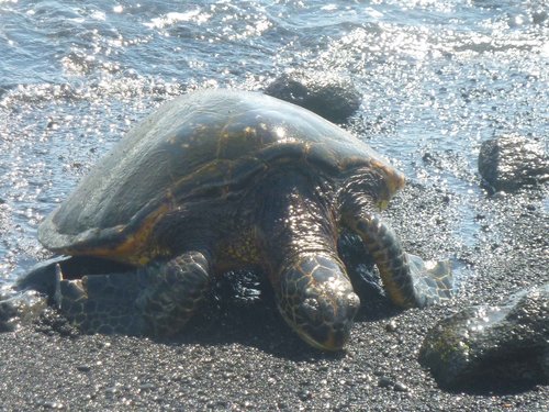 綠蠵龜,又名綠海龜,是海洋中的爬蟲類動物。一生中大多的時間都在海中生活,但演化過程中仍然保留了部分祖先的生活方式,所以必須回到陸地上產卵,繁育後代,形成了一種較獨特的生活習性。