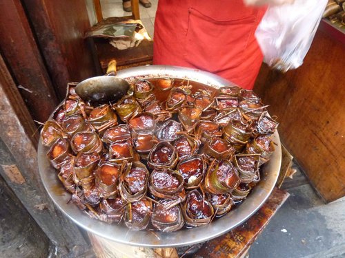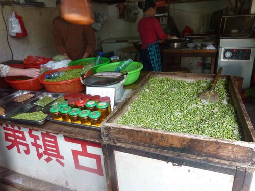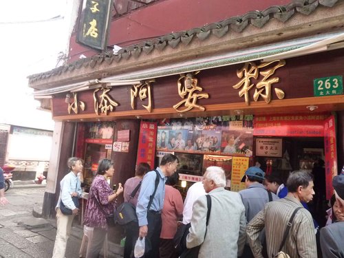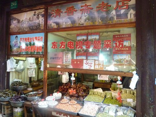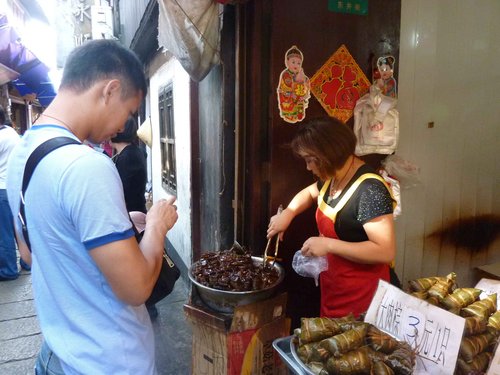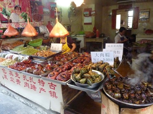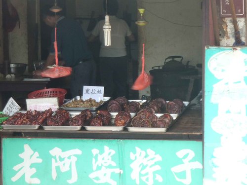 一過放生橋,迎面看到的就是著名的朱家角美食「紮肉」跟「粽子」.