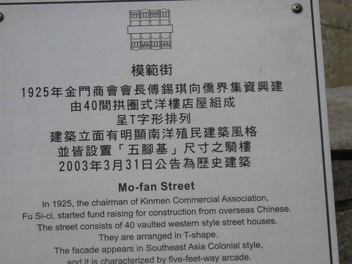 模範街是金門目前最具特色的古老街道,原為鄭成功練兵的內校場。民國十三年由華僑集資,興建一條融合中西建築特色並具日本大正風格的洋樓。