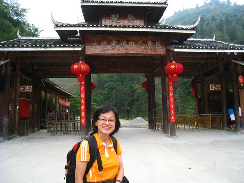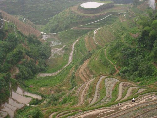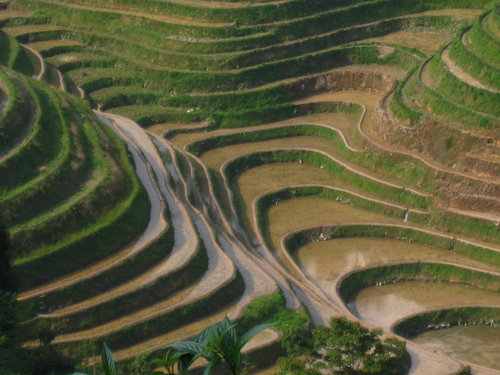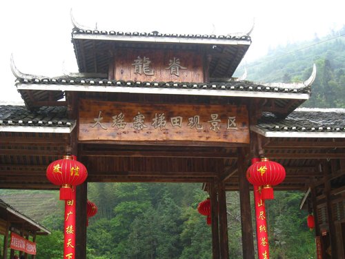 “龍脊梯田氣勢雄,千層萬級繞從峰,條條曲線盤青帶,道道橫縑幻彩虹,