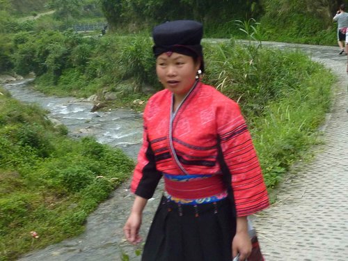 穿著傳統瑤族艷麗服裝、背著籮筐的瑤嫂穩健的踏著步伐、