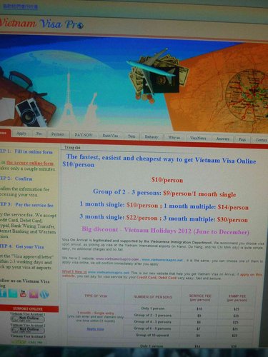 這一趟的越南之旅,讓我學會在網路上辦理越南簽證方式, 在此提供給需要的人參考: 辦簽方式: 1. 越南住台辦事處:,1020+400=1420 。 2. 旅行社代辦:約1550-1700不等 3. 網路E-Visa:網路上申辦時需用paypal繳費10 USD, 到越南時再繳25 USD。蓋章費 實際費用約1000元台幣。 我們人多採用網路上辦越南簽證(2人以上就有優惠, 我們10人每人6美元.由我代辦) 。 實際費用6+25=31美元 (約900元台幣) 流程: 1. 先上http://www.vietnamvisapro.com/網站 2. 依照網上步驟完成: