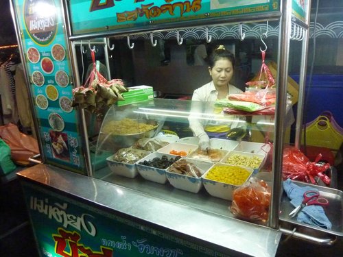炒河粉、泰式粿條、烤蝦、炸魚餅、烤魚等食物、蔬菜、水果的摩托長尾船