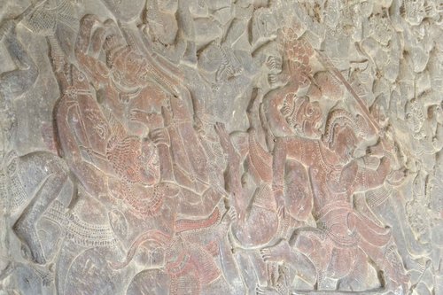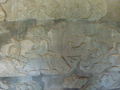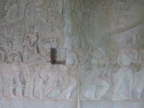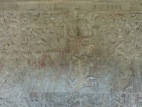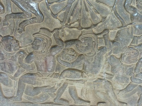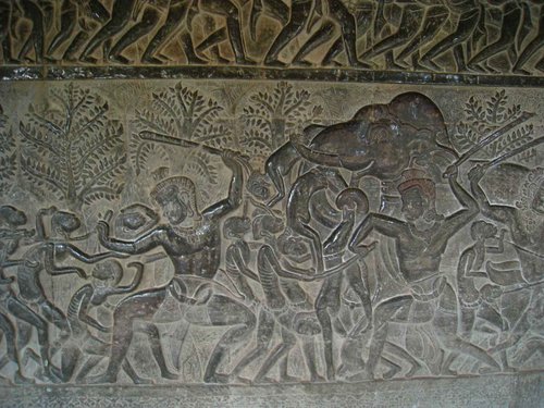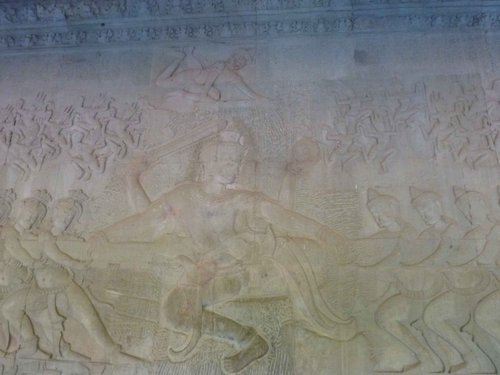 “乳海翻騰”是吳哥窟最引人入勝的神話故事之一。畫中描述一個非常有名的印度教神話故事:傳說大乳海之下藏有長生不老藥,起初神仙與阿修羅各自爭奪,但大家都無法成功,後來保護神毘濕奴 (Vishnu) 促成神魔訂下合作盟約,進行攪海取藥的工作。祂們的辦法是把神蛇Vasuki的身體盤繞著曼荼羅大山 (Mount of Mandara) ,大山作為攪海的杵,作為攪杵的攪繩,阿修羅持神蛇之頭,神仙持神蛇之尾,