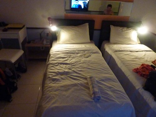 Langit- Langi Hotel 房間雖然不大,但比TUNE HOTEL 2人擠一張床好多了.