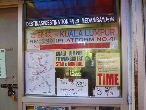 Seni搭車輾轉到了KL Central,已經9點半了。依照攻略上2樓購票,只看到票口貼了一張今日票已經售完的貼紙,啊!慘了,忘了今天是星期六,必須提早買票。這就是將帥無能,累死三軍最好的寫照,呵呵。