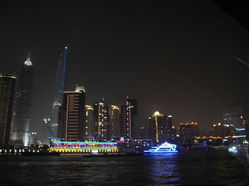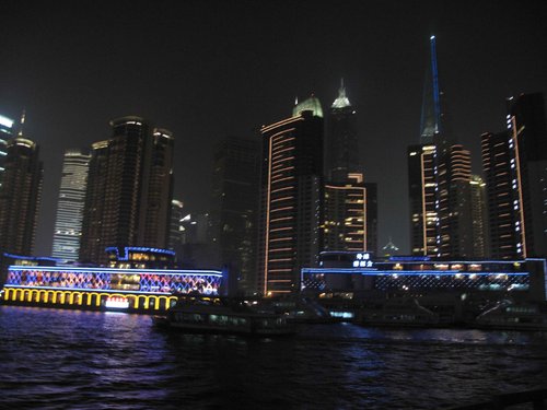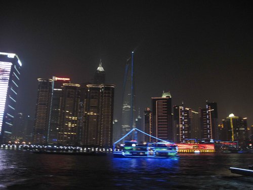 日落後,黃浦江的夜色更加迷人,霓虹滿佈的畫舫流過江水,