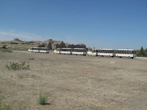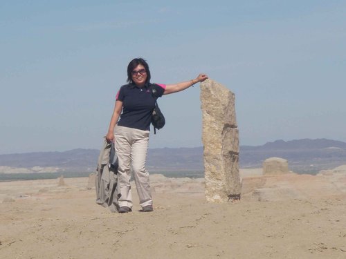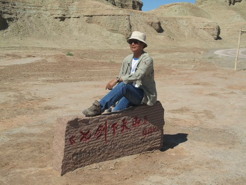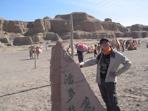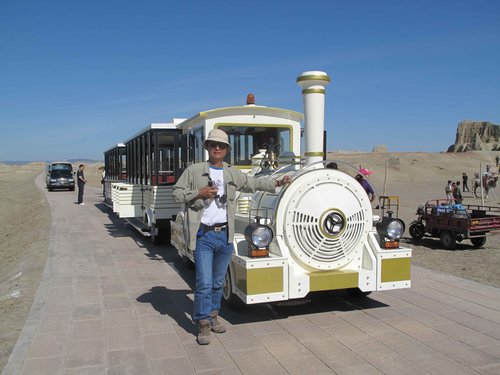 大約一億多年前的白堊紀時,這裏是一個巨大的淡水湖,後來經過大的地殼變動和千萬年的風雨剝蝕,湖泊變成了間夾著砂岩和泥板的陸地溝壑,裸露的土石層被狂風雕琢得像是一個奇形怪狀的古城堡。這裏四面都是茫茫戈壁曠野,四季多風,每逢大風降臨,風聲在土城內奔騰迴旋,淒厲嘶鳴,聲若鬼哭,“魔鬼城”因此得名。 驅車來到魔鬼城,門票30元,搭遊園車30元。背包客當然只搭11路公車,何況出發前已蒐集資料,魔鬼城還有著名的烏爾禾戈壁彩玉。用走的說不定會像“仙履奇緣”般撿到了彩玉中的極品“寶石光”喔,呵呵。 (2011年門票已經調整為46元,區間車不變) 造型可愛的遊園車,體力不好的人可搭乘,票價30元. · 今天陽光普照,烏爾禾魔鬼城充滿著陽剛之美, 既 既不陰森也不恐怖,完全沒有荒涼恐怖的感覺。 首先遇見的是孔雀迎賓. 勇哥,戈壁彩玉不會出現在大馬路上,走旁邊點. 烏爾禾魔鬼城除了地表的特殊景觀外,地底更是蘊藏 豐富的石油和瀝青,景區的另一側到處可見嗑頭機.