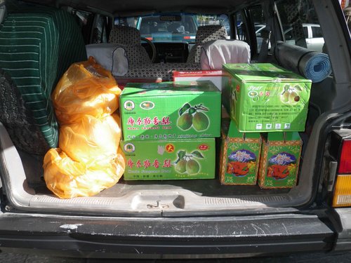 新疆兩位大哥帶了庫爾勒香梨、蘋果、礦泉水、泡麵、乾糧、