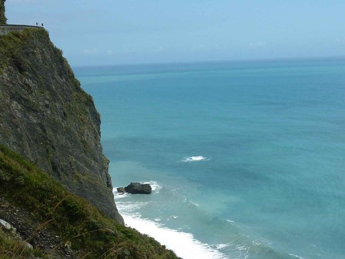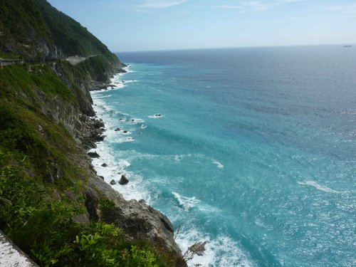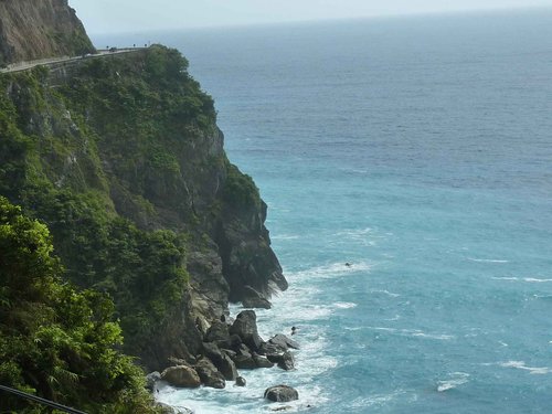站在海岸處從低處眺望蘇花公路,如一條細帶繞於峭壁山腰,