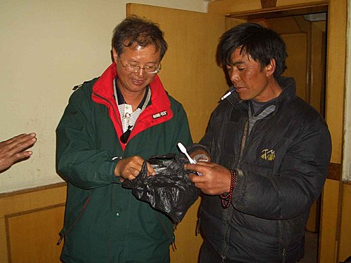 由於飯店有附設餐廳且房間也ok,想想大家也累了一天,就讓大家早點吃飯休息吧,因此決定晚上住在這裡。老邱和飯店老闆議價1間60元成交(標間雙人) 。當我們高興的出去轉告團員時,卻發現兩個師傅和他的愛人在外頭發飆。他們衝著老邱來,說他故意不讓他們一起和飯店老闆議價,(想抽佣金,一起去議價,) 。鬧了老半天就是為了錢,當初已講好一天480元,含伙食、油費。住宿跟著我們住,結果每天吃飯、住宿都還想抽頭,從第一天包車開始,幾乎天天都會出個小狀況。看著局勢越來越亂,尋求大家意見後,答應給他一間房間的佣金60元。本想應該沒事了,沒想到不到10分鐘他們又來了。這次換他的愛人出馬,口氣嚴厲,罵個不停。(沒想到藏女凶起還真可怕) 。仔細聽清楚,講了一堆理由,最重要的是不載我們要回去了。心理想尾款還沒付也不怕你耍賴,但再仔細思考後覺得已經撕破臉了,且團員實在不喜歡師傅(澤仁多登 )帶個愛人,每天開車話講不停,擔心行車安全,已經要我轉告師傅多次了。經過團員開會協商後,大家決定付清尾款,趕快脫離苦海。