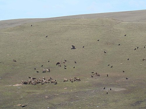 聚集於附近的山巒,等待啄食。天葬師將遺體骨肉剝離,將屍體分解給禿鷹