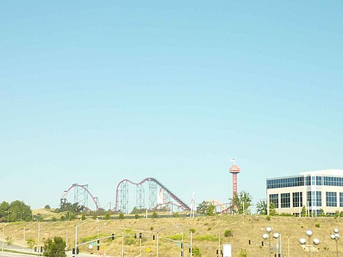 途經六旗魔術山,18年前帶學生來此旅遊,曾經坐了一趟雲霄飛車.今日如果再去,我已不敢再嘗試了,唉!歲月摧人老啊!此地對于癡迷雲霄飛車的人來說簡直是一處偉大的聖地.