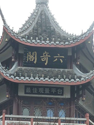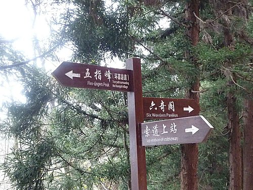 “六奇”準確地說是指山奇、水奇、雲奇、石奇、動物奇、植物奇。這是公園內惟一的人造景觀,它採用大理石和鋼筋混凝土等材料建成,高四層,飛頂,重簷突出,是一座集民俗、書法、自然景觀於一體的特殊樓閣。站在三樓,可以盡情飽覽張家界的壯麗風光。“江山留勝跡,我輩複登臨”、“欲窮千里目,更上一層樓”。站在閣頂,可以看到袁家界、楊家界、天子山、朝天觀、三姊妹峰……