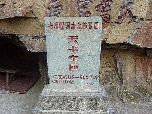 一個約20米高的圓形石柱,兀自獨立,頂端為一平臺,上面有一塊長約3米、寬l.5米的石匣,匣上有一個石蓋,一半淩空,一半蓋於匣上,周圍環繞著五棵翠綠的松柏。傳說張良曾將黃石公的三卷天書藏於匣內,後因戰事平息,張良又取出天書放置在其他地方,但他卻忘記合上抽蓋,至今留下一隻半掩半開的石匣。由於石匣內曾藏過天書,因而被人譽稱為“天書寶匣”。