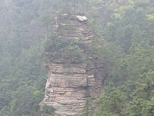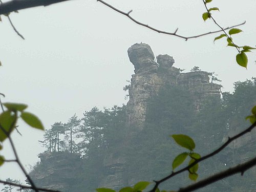 100多米高的石峰。它的下半部近似一個棱形台柱,台柱以上的部分微妙地構成一個肚圓、頸細、口向上翻卷的花瓶形狀,人稱“花瓶峰”。環花瓶峰樹木蓊鬱,芳草雜花叢生,如值群花爭香鬥豔季節,這裏紅綠相映,色彩斑斕,花瓶峰如置繁花世界。