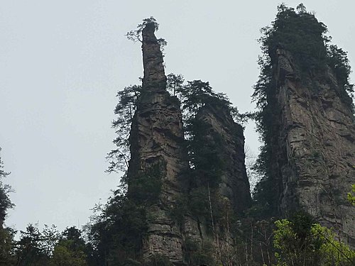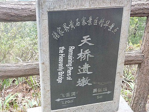 “誰說天宮風物好,人間即此勝天宮。”黃石寨與袁家界之間的峽穀中,千姿百態的石峰一支支、一排排、一層層,猶如出的海洋。在山風吹拂下,一股山的氣息撲面而來。這兒有6座高200多米的橢圓形石柱,一字排開,中間兩支石峰較高,兩邊兩支山峰漸次降低,略呈弧形。雨過初晴,彩虹為橋,青山為墩。“遺墩”長在,“天橋”卻不常有,人稱此景為天橋遺墩。有人這樣與道:“仙橋玉柱尚依然,齊插青雲碧落間。願得長虹橋一架,廣寒宮裏下嬋娟。”