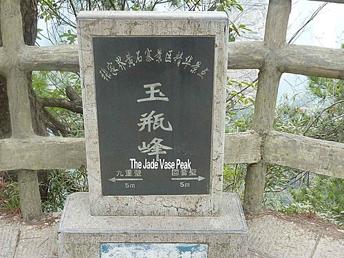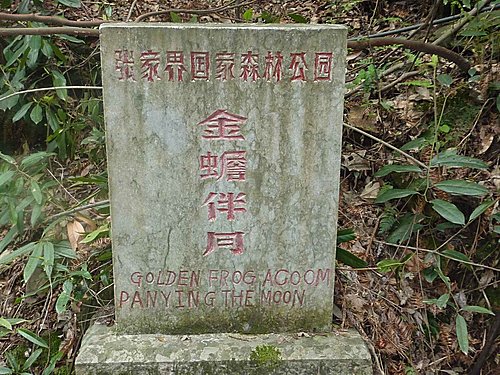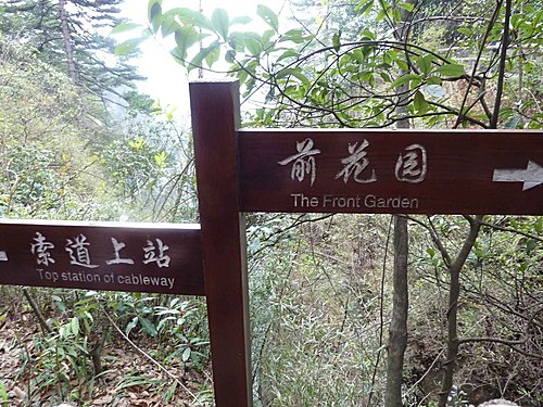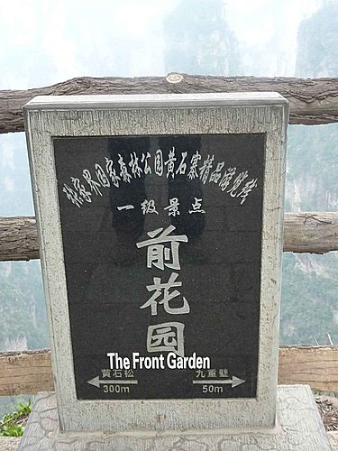 黃獅寨頂東南沿俯視左側,見數十座石峰構成的幽谷。穀中凝碧瀉翠,花團錦簇。峰頂峰壁,或綠樹覆蓋,或丹岩映日,古松展枝似傘,灌木掛壁如帶。春夏山花獻豔,萬綠叢中朵朵紅雲,秋冬楓葉流丹,幽壑之間片片彩霞,酷似一座花園。園後,峰外有峰,林外有林,層次分明,漸遠漸淡。谷右側,8座高達300多米的石峰連成一體,橫亙千米。其下端有一巨峰雄踞谷中,周圍8座小峰環列,小峰頂平整如桌面,白光反射如積雪。為有別于袁家界之“後花園”,故名“前花園”。