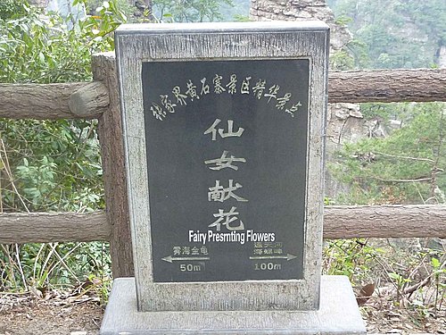 朦朧的雲霧中有一個美女的倩影在雲霧中亭亭玉立。她頭別花簪,懷抱花籃,面如滿月,嘴含微笑,正深情地把朵朵鮮花撒向人間,因而稱之為“天女獻花”。傳說她是玉帝的小女兒,因眷戀人間景色,偷偷帶走天宮的花籃私自下凡,邊走邊抛灑鮮花,因此這滿山遍野的奇花異卉都是她留下來的。由於小仙女私自下凡,惹怒了玉帝,玉帝一怒之下將她貶落人間,於是,她便成了這裏的花神,日夜守護著這片美麗的淨土!