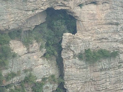 “人在崖上走,雲從腳下生。”眼前那巨大厚實的石壁中間,有一個大岩洞,深10餘米,寬約5米。這是怎樣形成的呢?當硬岩層蓋于石峰之巔時,如果下部是軟弱岩層,在風化水蝕作用下風蝕得較快,便形成洞穴。一到雨霧天氣,霧氣就會從洞裏穿來穿去,所以命名為飛雲洞。