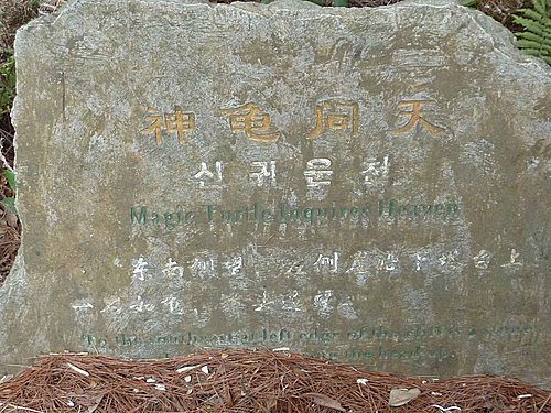 一塊大石頭上趴著一隻母龜,它旁邊幾米遠是一個酣睡的小兔子,不遠處一個小山頭上蹲著它的伴侶公龜(聖龜),一棵綠色小小樹緊貼著它的腦袋生長著。聖龜為何要問天呢?原來是個有關“綠帽子”的有趣傳說:小兔子其實是母龜的兒子,聖龜覺得很納悶,為什麼別的龜生出來的都是龜,它和母龜生的卻是一隻兔子呢?怎麼也想不通啊!鬱悶之極便頂著綠帽(那棵小小樹)爬上對面山頭去問天。哈哈,真有想像力。
