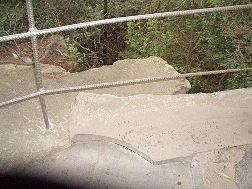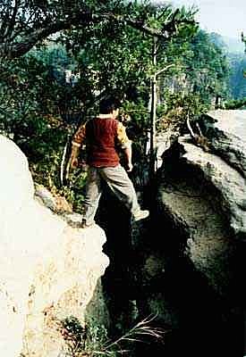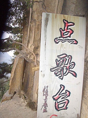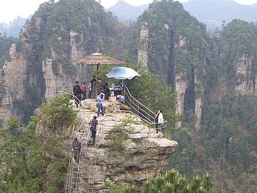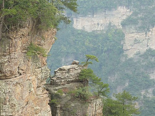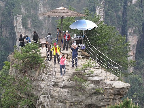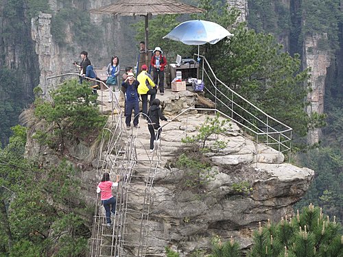 [一步難行] 一座危崖隔開,深臨100米。隔著兩塊巨石,前面一塊長約20米,寬僅2米,是一極佳觀景台。以前旅者都是靠跳過去才能一領天子山神采。但並非所有人都敢站上去的。據說北京大學航空航太學院的一個老教授,和朋友嘗試〝一步難行〞。朋友都一步過去了,但他的一步卻不夠大,就摔下去了,嚇的所有朋友都癱在對岸不敢回頭,最後教授的兒子把他葬在天子峰上,並寫上“一步難行。一失足成千古恨”張家界很險啊!!從那以後,就很少有人敢過去了,直到修好了這個鐵橋。