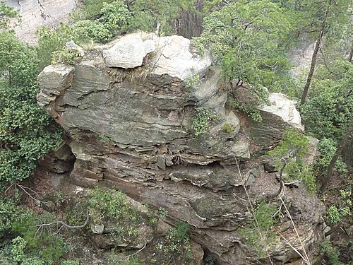 南天一柱”有頂天立地之勢,故又名“乾坤柱”, 海拔高度1074米,垂直高度約150米。頂部植被鬱鬱蔥蔥,峰體造型奇特,垂直節理切割明顯,倣若刀劈斧削般巍巍屹立於張家界。