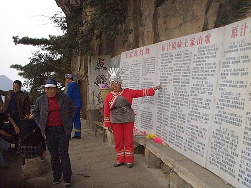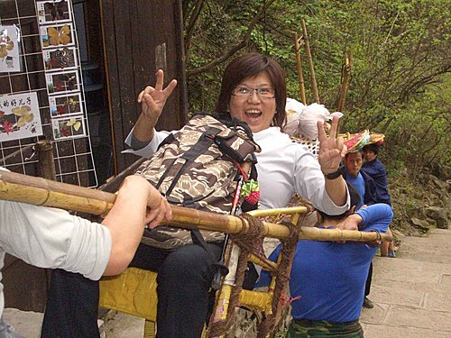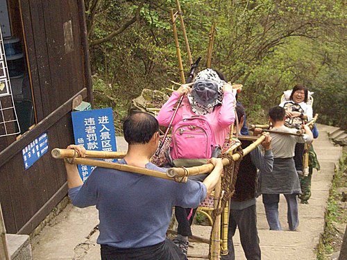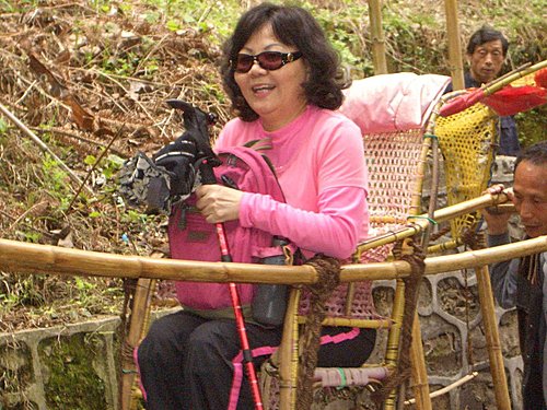 走了一天半,終於有人哀求要搭滑竿了,唉!算了,出門就是要讓自己高興嘛!累垮了,拖累整個團體也不好,當初只是嚇唬她們,說會被會長開除。其實會長很隣花惜玉的。哈哈。可是沒想到這段滑竿之旅,竟然只到烏龍寨門口為止,(因為到烏龍寨的路太窄,且險峻禁止滑竿進入) 。接下來還是要走路,天下沒有白吃的午餐想看美景,就要付出代價。