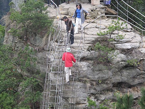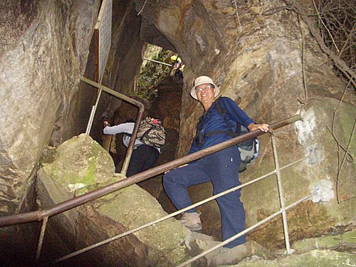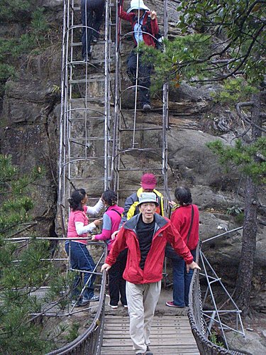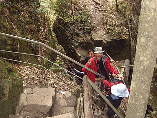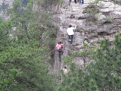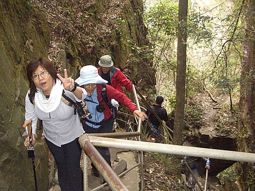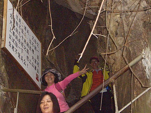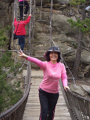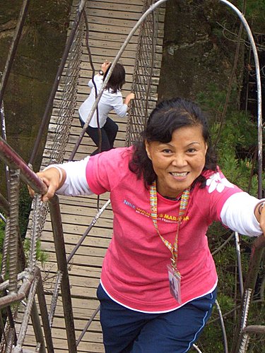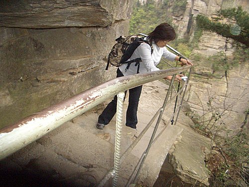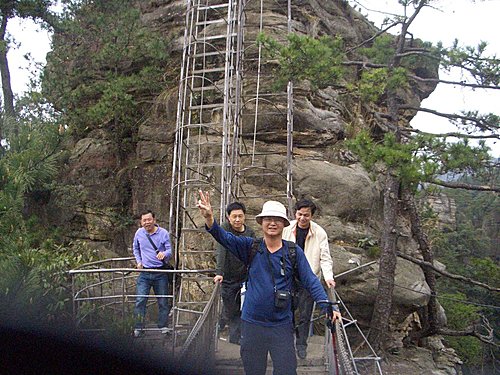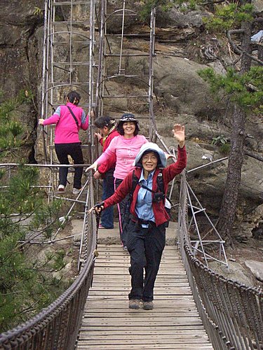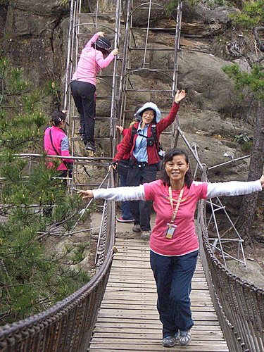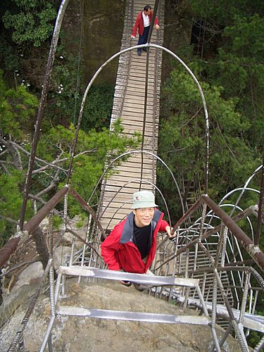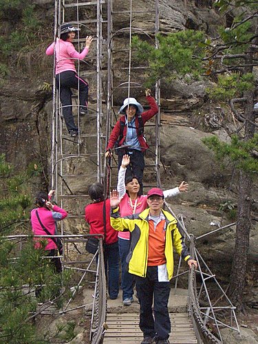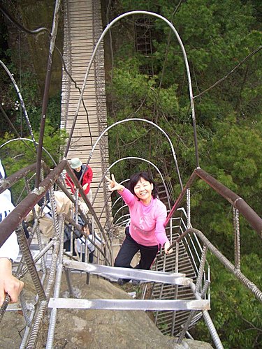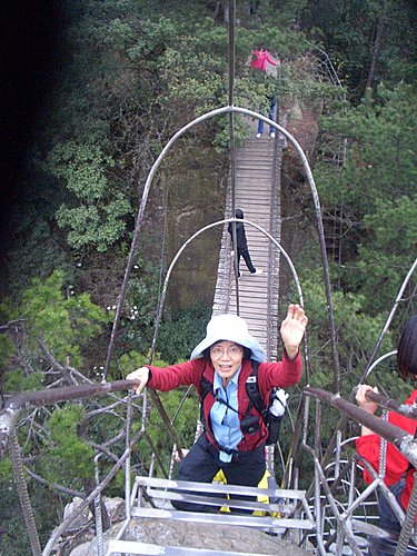 走到此地,多位團員已經兩腳發軟。再看到要走過那搖搖欲墜300多米懸空,10多米距離的吊橋,最後才爬上幾乎90度的鐵梯,因此紛紛打退堂鼓了。至於我,當然不能漏氣。身先示卒,一馬當先殺過去了。