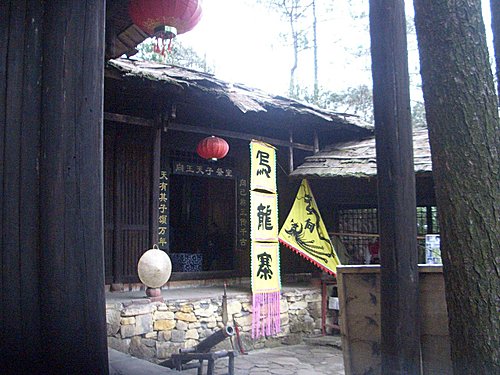 前行幾百米,於一靜幽之處鑽進小道,此間灌木稠密,怪石林立。陰森之中,讓人感到一種寒意,拐了幾個彎,山裏出現一座兩層木屋,木樓右側是斷崖深谷,狹窄的石路臨崖蛇行,一道寨門鎖住小路,上有“烏龍寨”3個字。