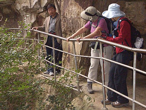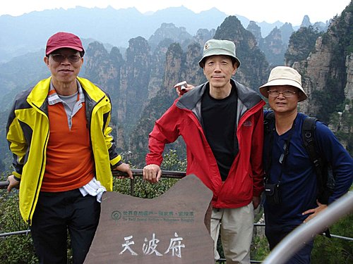 走過搖搖晃晃的索橋,攀上天波府山頂,萬般景物盡收眼底,遠山近壑壯觀靈秀,滿目空曠,開闊無比,奇峰異石,佳景天成。如此美景怎可讓團員錯過呢?因此從山頂上拼命招手,總算把團員一一拉過來了。