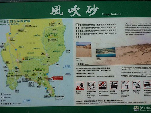 風吹沙】界於龍磐公園與佳樂水之間,其地理景觀與附近的珊瑚礁岩大不相同,其上之砂河、砂瀑、砂丘是風吹砂最特殊的景觀。冬天強烈的落山風將砂吹上坡,夏天雨季時河水將砂沖向出海口,形成長期侵蝕而成的風蝕地形,近年來由於佳鵝公路的闢建與木黃麻的栽植,阻止了沙源的流動,已不復當年之壯觀矣!