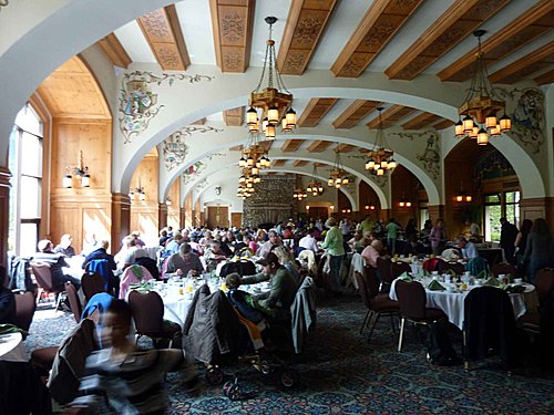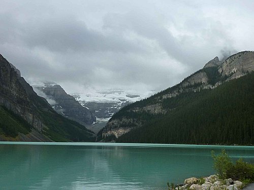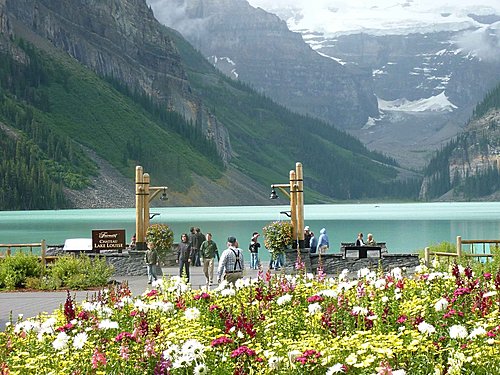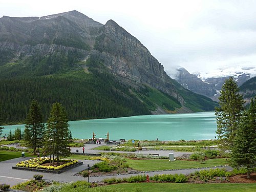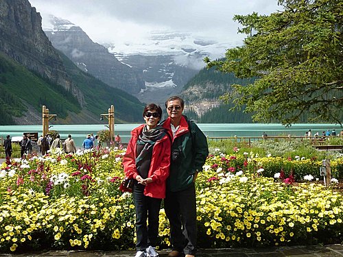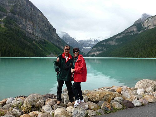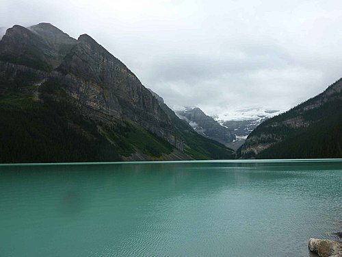 露易斯湖就像靜躺在落磯山脈間的藍寶石,三面環繞著雪山。來到這裡站在湖邊凝望著她,彷彿來到仙境,時間和空間都靜止了。可惜的是導遊交代只有半個小時欣賞(中午吃飯時間已排定在飯店享用自助餐,不能遲到),只好努力拍照,用相機捕捉這些美景,等待回去後再好好欣賞。(建議如果參加落磯山旅遊,一定要住露易斯湖城堡飯店,因為旅行社可拿到便宜的房間。旅行社行程住宿安排,住班芙和住城堡飯店只差30元加幣。如果自己訂城堡飯店,大約599元加幣+稅金)
