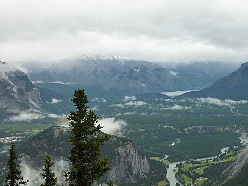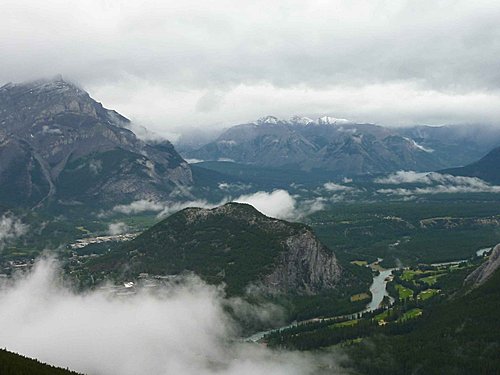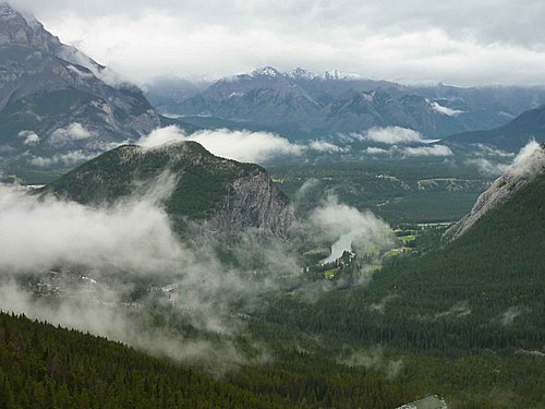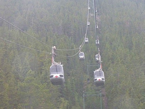來到硫磺山,導遊交代好集合時間後,大家就分批搭上纜車.今天雖然氣候不佳,但隨著纜車爬升,還是可看到壯碩的石壁與峰峰相連的高山,被雲霧籠罩,形成濃密的雲海,山好像在虛無飄緲間,有時隱約露出高聳的山頭和碧綠的弓河,宛如一幅巨大的國畫,氣勢磅礡,震懾人心!搭著纜車跨越一棵接著一棵的針葉林登上山頂,落磯山脈的全貌一覽無遺,雖然寒風凜凜的吹著,但心中澎湃的熱情實在無法言喻.