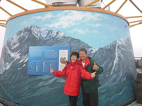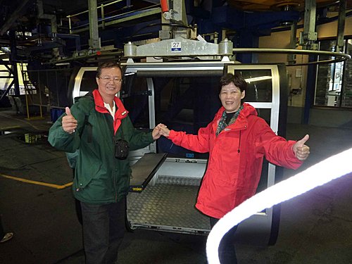 大約7.8分鐘纜車到達山頂,一下車四周霧朦朧,外頭冷的受不了,本來還想走天空步道(skywalk)到氣象觀測站,(來回需時約40分鐘)也只好作罷。在屋外拍了幾張相片後,就趕快躲進觀景台上的咖啡廳休息。