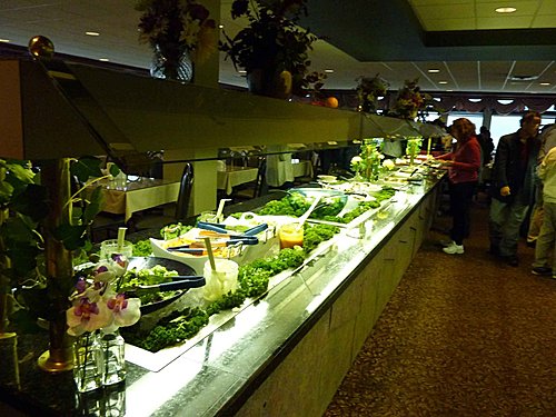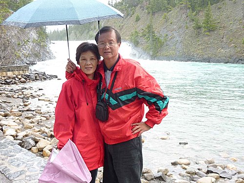 中午在冰原的餐廳享用自助餐,美食加美景讓人食慾大增。可惜天公不作美,竟然下起大雨,直到上車前雨都未停。因此第二站硫磺山只好改到第二天去,車子直接開到班芙。路途中在弓河瀑布(Bow Falls)停留,讓大家拍照後,就直接到班芙。