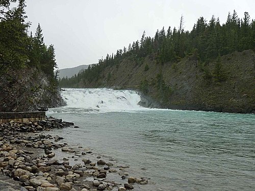 弓河瀑布顧名思義,就是指在弓河上的一個瀑布,這瀑布雖然不是很寬,落差頂多不過十餘公尺,但由於弓河的水量充沛,所以也是氣勢磅礡。在弓河瀑布旁的樹林中,我們可以發現到這裡最為著名的旅館---菲爾夢班夫溫泉旅館( Fairmont Banff Springs )的巍峨建築已經聳立在林端。1953年瑪麗蓮夢露在此拍攝"大江東去"(River Of No Return),細雨綿綿中,站立在此地,緬懷往日,心情感觸很深。