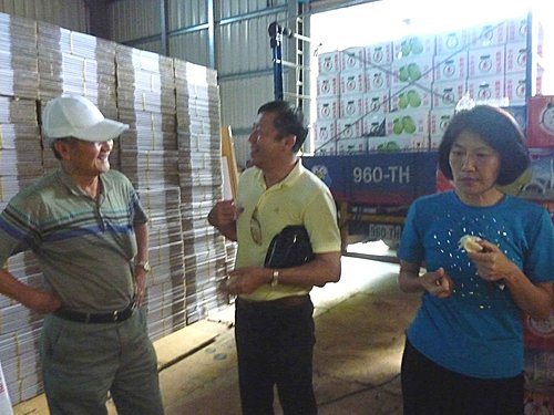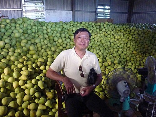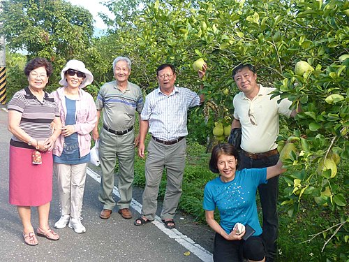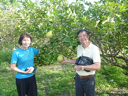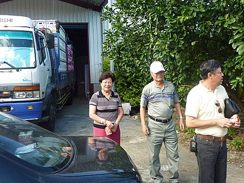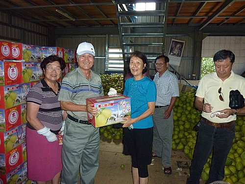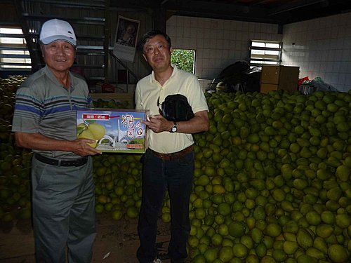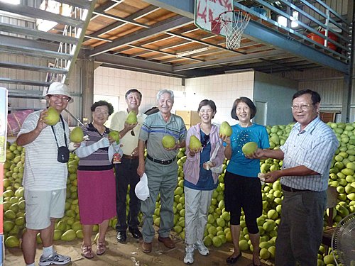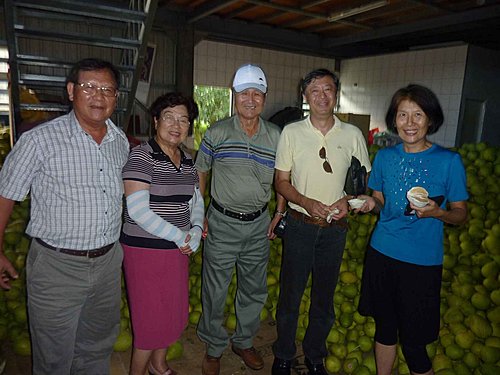 聯絡內人三哥(住瑞穗) ,準備去採柚子。沒想到他們已出門到北部,心想每次到瑞穗,他家的車庫都會放很多柚子,因此將車開到他家準備拿幾個給日本朋友嚐嚐。沒想到找了老半天竟然一顆都沒有,只看到一串香蕉,大家也不客氣的自行摘取品嚐,吃完香蕉後準備轉往赤柯山,沒想到車子才剛開出去,內人眼尖看到友人林老師,開車追過去攔下他,詢問哪家的柚子好吃,他很阿莎力的說跟他走,隨著他東繞西繞來到一座柚子園,進入房裡後看到柚子堆得像座小山。經林老師介紹,原來是他的姐夫賴先生(老師退休)和姐姐。賴老師說得一口流利日語,和黑木先生聊得很高興,大家邊吃著柚子邊聊,鶴岡的柚子甜,肉又細一點都不輸麻豆柚子,今年又沒有颱風及碰到大雨所以特別好吃.最後離開時他們還送我們每人一箱柚子帶回去,哈哈;今天真是個幸運日。