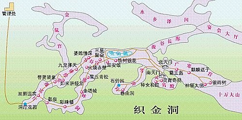 織金洞內根據其不同景觀和特點,分為迎賓廳講經堂、雪香宮、萬壽宮、廣寒宮、靈霄殿,山湖、水晶宮等十一個景區,四十七個廳堂。一進洞內,就被氣勢磅礡的溶岩景色震撼到,洞內多樣的溶岩景觀,有山有水,有景有物,山水相連,景物交融,令人目不暇給,彷彿置身於蓬萊仙境、由於景點太多只好簡略的介紹一些: