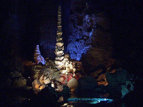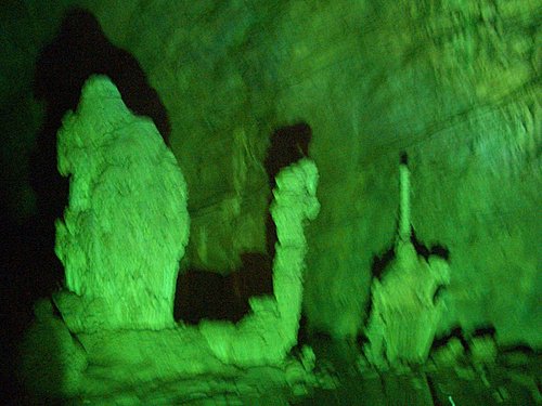 隨著導遊的解說,再加上織金洞風光獨特,溶蝕形態鐘乳石堆積物,在燈光的照射下形成光怪陸離的奇妙景致,給人無窮的想象空間。由於已近中午,導遊大概也餓了,所以走的很快。但織金洞道縱橫交錯,石峰四布,流水、間歇水塘、地下湖錯置其間。高大的石幔、石帷如從天上垂下,顏色各異。地下煙河煙霧縹緲,深邃莫測。讓所有遊客都流連忘返,不時停下腳步,發出讚賞、驚嘆聲。整個行程在導遊的催促中也花了2個多鐘頭才走完。