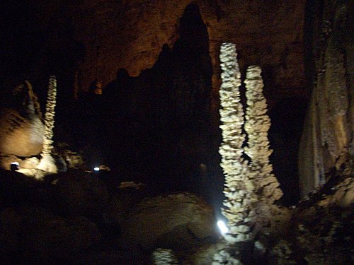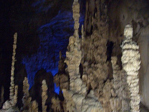 由於路途遠,因此一大早7點就出發。昨天小周開了10幾個鐘頭的車,今天一早又出發臉色不是很好看,還好幾個女生一路誇他,讓氣氛稍微和緩些。一路上都是綿綿不絕的盤山公路,景色雖美但小方和小周路況都不熟,邊開邊問路,開了快3個鐘頭了還不知織金洞在哪裡,小周有點要發狂了,拼命按喇叭,嘴巴也不停的唸小方當導遊還不知道路(應該司機要知道路才對吧) ,小方還是學生老實不敢回嘴,我們只好拼命安撫小周,心理有點後悔跑那麼遠來這裡幹嘛!好不容易來到織金縣城,找個地方買一些飲料讓小周休息一下。經過短暫休息後再度出發,沿路又是崎嶇山路,看著小周忍著不發怒的臉孔,鼻子聞到車子因長時間煞車而產生的焦味,心中只有念著阿禰陀佛了。開了約4.50分鐘終於到了織金洞。