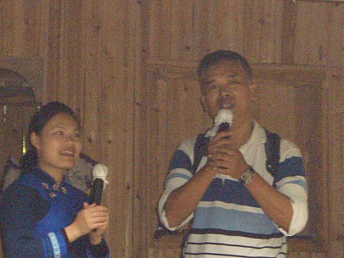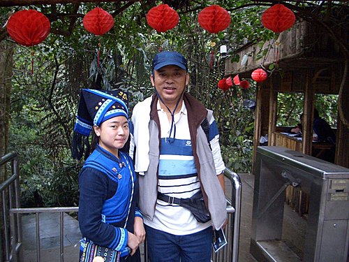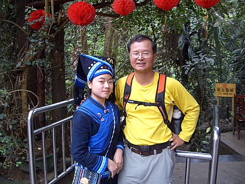 沿階而上,快到出口時有一壯族對唱歌台,葉兄不禁隨口哼了起來「阿里山的姑娘美如水啊…」這可是大陸人耳熟能詳的台灣國歌,台上兩位年輕漂亮的壯妹耳尖聽見了葉兄歌聲,熱情邀約上台對唱,葉兄恭敬不如從命,上台跟美麗多情的壯妹合唱了好幾首歌曲,令人驚呀她也唱了一首字正腔圓的愛拼才會贏,台上高歌,台下喝采,互動融洽,最後賓主盡歡。