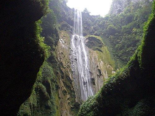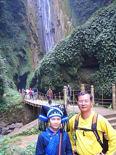 通靈大峽谷位於中越邊界,扶梯而下,幽幽深邃,靈氣飄逸,古樹老藤遮天蔽日。今天天氣好,風和日麗涼風徐徐。瀑布高達188米,真的是銀津飛瀑天上來,非常壯麗偉觀,走進瀑布峭壁內的神秘洞穴,巨型鐘乳石高崖倒懸,深潭星羅棋布,水帘洞、地下水、氣象萬千的九疊瀑布,河洞曲回流水潺潺,溝谷青翠欲滴,洞內還有岩棺崖葬景觀,望著一旁龍首造型的石缸,涓涓泉水不停的滴入。腦中突然浮起當年楊過小龍女兩人生活的情景,莫非當年楊過小龍女也曾在此spa鴛鴦戲水。