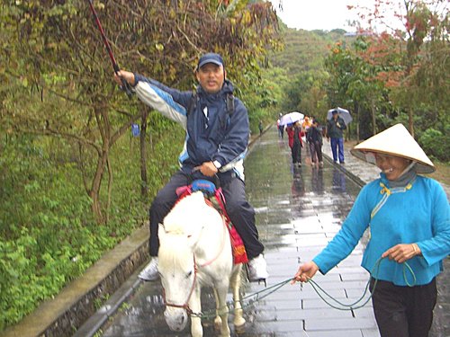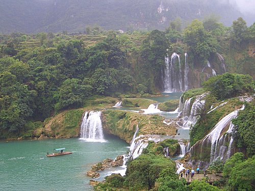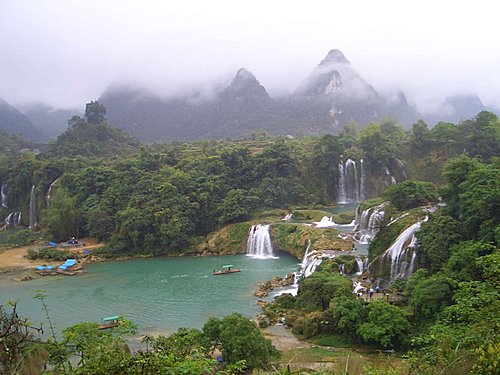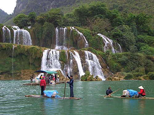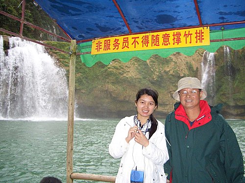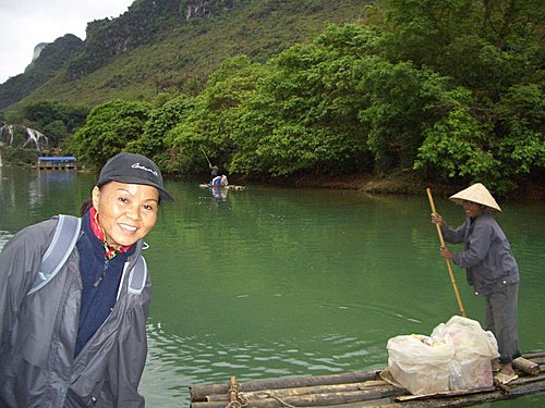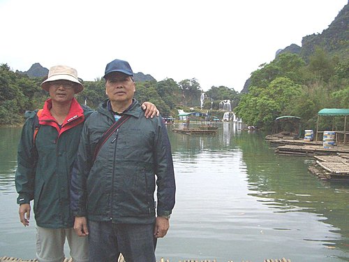 拾級而下數十米,走進瀑布飛瀉區,有許多大竹排停在那兒,每人收費20元,可划到瀑布下.因部份團員對價格有意見,大家約好會面時間後,就分道揚鑣.我和麗珍.王兄覺得瀑布雖然沒有想像的壯觀,但既然來了就去看看吧!船夫撐著船慢慢的向瀑布划去,沿途很多越南人划著小船吆喝招攬生意,毛毛細雨中瀑布變幻多姿,碧水長流.綠翠如茵,別有一番風味. 在竹排上精心選好角度,擺好pose,留下一張張精采相片,想讓沒來的團員看了後悔.
