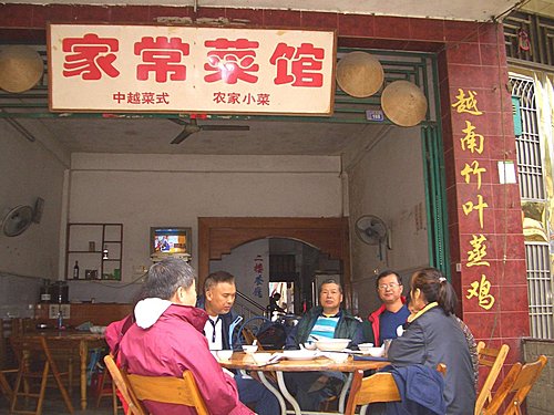 今天要住的旅社友誼賓館,在網路上評價蠻不錯(標間雙人房50元,房間很乾淨,隔著一條小河對面就是越南).老闆個子雖不高,但很豪氣.他的口頭禪是做人不要冷冰冰,要熱情.要樂於助人.雖然第一次見面,但讓人覺得很親切.和小摩的車師傅談好到德天瀑布車資,2輛每輛來回40元後,就找了一家越南家常餐廳吃越南菜共100元,俗又大碗,完全符合背包客的需求.
